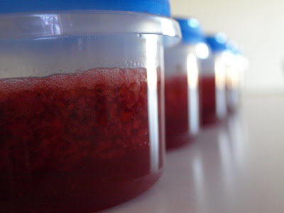 I have never ever made jam, jelly, or preserves, and I never thought I wanted to until I read this over at Our Best Bites. It's a crazy easy recipe that's perfect for taking advantage of the great price on strawberries right now. Oh, and the recipe is right on the box with variations for all types of fruit. I used the less-sugar pectin from Sure-jell in the pink box and it came out plenty sweet. I did have to cook it a tiny bit (like two minutes) but the regular Sure-jell freezer recipe you don't have to.