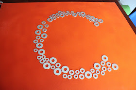 After Cal J and Ry-pies's room switch - Cal J's room has been lacking in the "wall hanging" department. I saw this fantastic idea to use washers (you know, from the hardware store) to create a design on a canvas. I love it!
